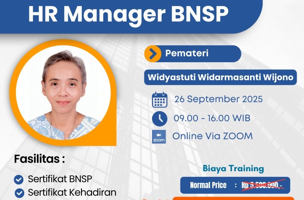 Pelatihan Manajer Sumber Daya Manusia (SDM) dirancang untuk mengembangkan kompetensi strategis, teknis, dan kepemimpinan bagi para profesional SDM yang menduduki atau dipersiapkan untuk posisi manajerial. Pelatihan ini mengacu pada Standar Kompetensi Kerja Nasional Indonesia (SKKNI) No. 149 Tahun 2020, yang mencakup keterampilan dalam merumuskan kebijakan, menyusun strategi pengelolaan SDM, serta mengawasi implementasi program pengembangan, pengupahan, dan hubungan kerja. Program ini bertujuan agar peserta mampu menjalankan fungsi manajemen SDM secara menyeluruh dan terintegrasi, serta berperan aktif dalam mendukung pencapaian tujuan strategis organisasi.